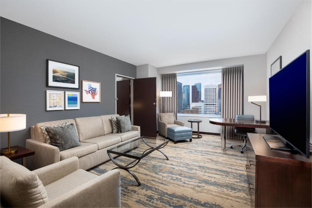 Experience true comfort in the well-appointed rooms of Hilton Houston-Americas, where every detail is designed for your convenience and relaxation. Each room features air conditioning to keep you cool, along with blackout curtains that ensure a restful night's sleep. Unwind in the separate living room or step out onto the balcony or terrace to enjoy the fresh air and scenic views. For your entertainment, satellite and cable TV, in-house movies, and a television provide endless options for relaxation.