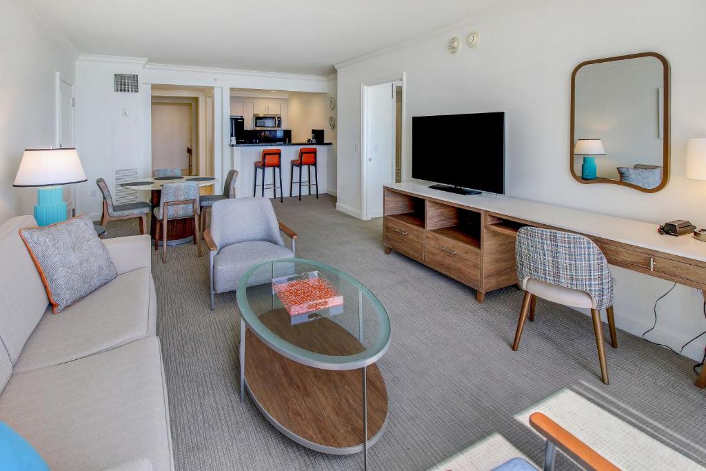 The location was beautiful and exceptional. The staff was very nice. The room was clean and the kitchenette had sufficient supplies. The pool was warm and very pleasant and we were glad it had a hot tub as well. The only negative is not having enough towels at the pool and the pool and hot tub closing early in the evening. The beach location is very convenient and it was great having beach chairs set up with towels and new water bottles every day. They have a very nice restaurant too that provides breakfast, lunch and supper with outdoor seating facing the beach as an option.